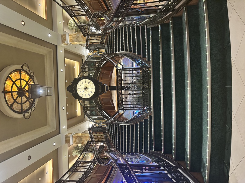 The Queens Room, the main ballroom, offered a beautiful space where you could see from one side of the ship to the other through the windows—adding to the ship’s intimate charm. They host a very popular afternoon tea here daily. We also saw the casino, which was small and unobtrusive, and the lovely theatre with great views from every seat.